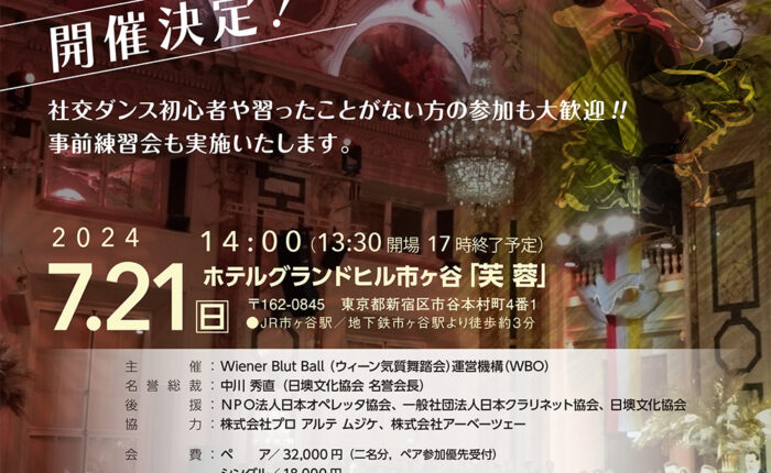 2023.12.06 2024.01.12 2024 日本で舞踏会を開催いたします! 2024年 7月。 いよいよ日本でウィーン式の舞踏会を開催いたします! 詳細はこちらから>>https://wbo.jp/information/wbb2024